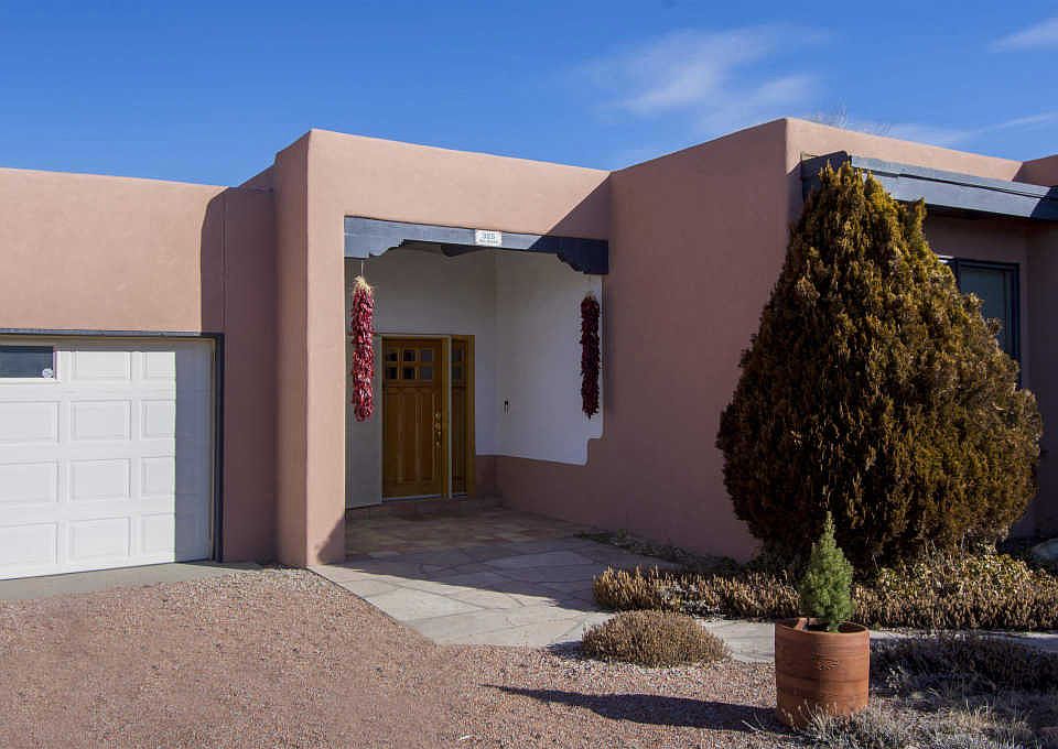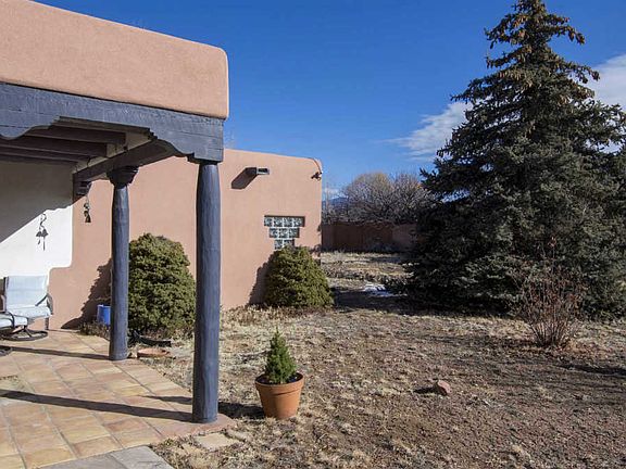 A house like this is worth a good look! In town, but on an acre+ with magnificent mountain views, convenient to all amenities. Santa Fe style, and beautiful finishes throughout, with vigas, & saltillo tile floors. Other features include a new gas downdraft 5-burner cooktop, 2 wall ovens, 2 wood-burning kiva fireplaces, torch down membrane roof, radiant heat, and a security system. 2800 sf includes 3 bedrooms, 2 baths, living room, den, eat-in kitchen, dining room, and heated room off the garage, suitable for small studio, office, or storage. The garage holds two cars, and there is plenty of room in the driveway for several more vehicles. Although it's in the city limits, the property is on a private well and septic, but city water is at the street. The lot is fenced with chain link in the back so that the mountain views are not obstructed, and half the property is walled with adobe bricks. Two covered patios complete the picture, providing a comfortable and lovely home that's ready for you to make your own.