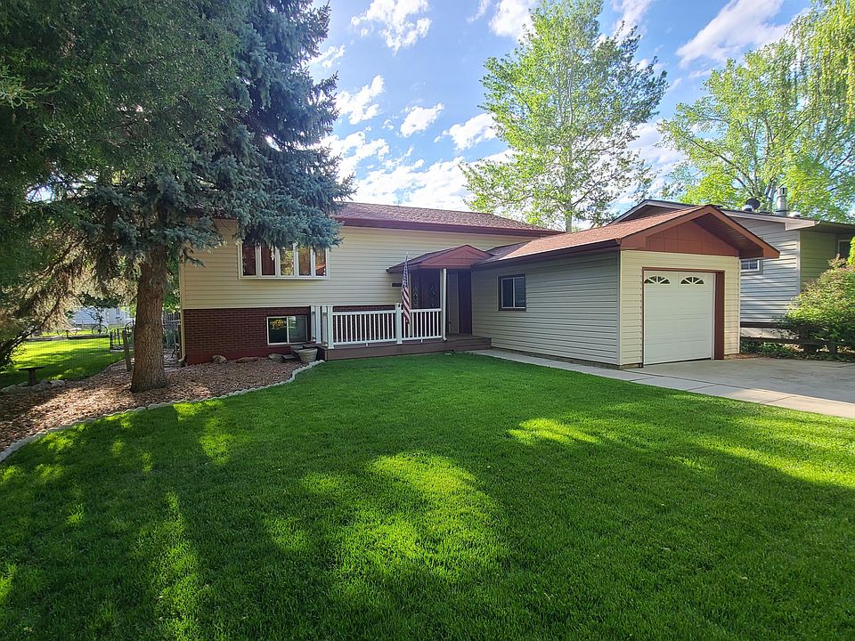 Check out this very well kept bi level home with a well manicured treed yard on two city lots with room to build a extra garage/shop. The Home consists of 3-4 bedrooms, 2 baths, updated windows and siding, and a covered back patio/deck. This is a must see home to appreciate.
