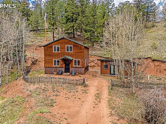 Welcome to this stunning Colorado Mountain cabin retreat nestled on a private, wooded hillside in the heart of Rainbow Valley. Very well meticulously maintained, this home blends rustic charm with modern finishes. Cedar siding, vaulted ceilings, and natural wood paneling set the tone, while a cozy wood-burning stove and sleek black steel railings bring a contemporary touch. The open-concept layout includes a well-appointed kitchen with stone countertops and wood-paneled accents, perfect for everyday living or entertaining. One bedroom is located on the main level, while the upstairs primary suite features a corrugated steel accent wall, full ensuite bath, walk-in closet, and direct access to a spacious loft that can flex as a guest space, office, or media area. An oversized work shed provides excellent storage or workshop potential. Tucked among towering pines with few neighbors in view, this home offers seclusion without sacrificing convenience. Enjoy easy access to Highway 24, Cripple Creek, Mueller State Park, the Crags, and miles of nearby hiking trails and fishing ponds.... plus who wouldn't love to be able to have convenient sledding and other winter activities such as cutting your own tree. Close to counties that boast skiing options. This is mountain living with modern appeal — a rare gem in a peaceful, sought-after location.