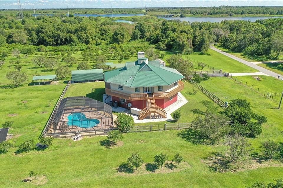 No HOA here! So bring the horse and trailer.This fully fenced acreage is waiting for its new owners. The property currently has orange groves, grazing land, farming land, water access, spectacular views from ALL angles and most of all, peace and quiet! This unique octagonal-constructed home not only keeps you safe from the Florida weather by design, it offers majestic views and plenty of living space. The natural setting provides proximity to wildlife, fishing and only minutes to Lakewood Ranch, Bradenton, Ellenton and Sarasota. Enter from the wrap around 2nd floor deck to the expansive great room.Boasting a floor to ceiling wood-burning OR gas fireplace, the character from the high ceilings and gorgeous beams invite endless entertaining opportunities. The ground level offers an office and other multiple bonus spaces, which could easily be turned into an in-law suite if desired. Some of the homes features include Zoned A/C system, metal roof (installed 5 years ago), 18 kw generator, 250 gallon propane tank(owned), solar heated inground pool (resurfaced 2019), 4 covered carports and 1 shed are on property surrounded by fence along the entire 5 acres. Clear a path to the creek behind the home to fish or use kayaks to paddle just downstream to Lake Manatee. You do not want to miss this extraordinary opportunity to own 5 acres, an incredibly unique â custom built home that you will enjoy day after day after day!