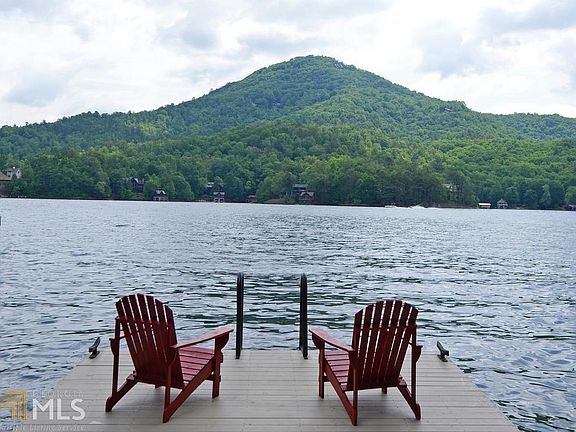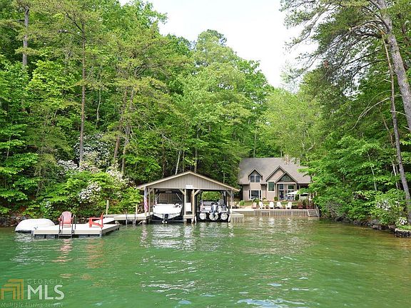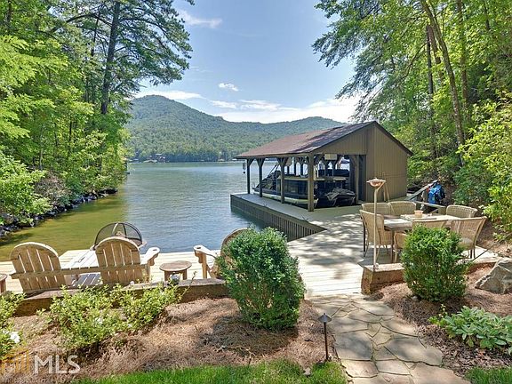 This Lake Burton gem features a rare combination of main lake location, panoramic mountain views, and a 1.75 acre lot with flat lake front--very few steps. Enjoy the view of Charlie Mountain and main lake from your own private cove. Main level includes vaulted living room with masonry fireplace, master suite, updated kitchen with stainless appliances and solid surface counters, separate dining area and 2nd full bath. The sunroom off the kitchen makes way to the private outdoor living space including a patio, deck with gazebo and noisy creek. Upstairs are 4 additional BR and 2 BA. The lakefront features seawall, extensive wharf, and 2-stall boathouse with lifts and storage. Ample parking for family and guests as well as access by (mostly) paved roads.