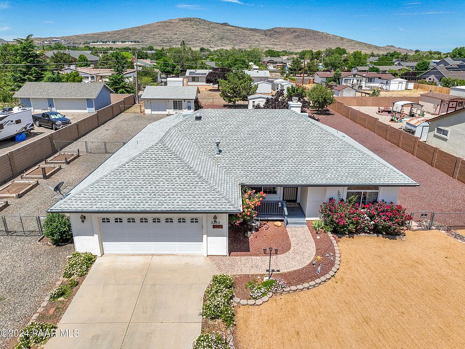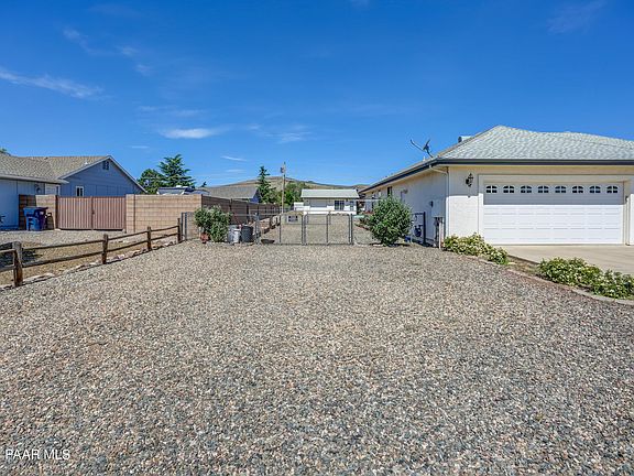 Half Acre 3 bedroom, 2 bathroom, 2 car garage home with guest casita an additional single car garage close to Prescott Valleys entertainment district. RV parking completely fenced off from the rest of the yard. Large fenced backyard with lots of rose bushes, mature trees, raised garden beds, and grass create a serene park like environment. Guest house has a studio and a 3/4th bathroom and 1 car garage/workshop. Storage shed for additional storage. Refrigerator washer and dryer stay for an easy move in. Cozy stone gas fireplace. Newer white cultures marble shower in primary bathroom with double sink vanity and walk in closet. Split floorplan. Large front yard with additional parking available.