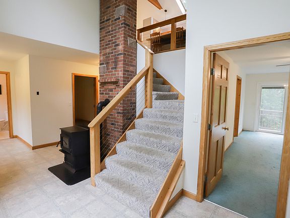 Located just minutes from the airport, this unique 3-bedroom contemporary home offers a comfortable and convenient living experience. As you enter, you are greeted by a bright entryway featuring a pellet stove with a thermostat. The first floor accommodates three bedrooms, including a primary bedroom and a second back bedroom both with patio doors leading to their individual decks. These two bedrooms are connected by a large bathroom boasting a double vanity and a shower. The third bedroom is accompanied by an adjacent half bathroom. Upstairs, you'll find a galley-style kitchen with an island, a dining area with sliders to a third deck, and a living room, all with cathedral ceilings that create an open feel. The upper level also features a full bathroom with a large soaking tub and skylights. The full walk-out basement offers the potential for two additional rooms, with two sets of sliding doors providing easy access to the outdoors. Outside, there is a shed for storing lawn items, and a large one-car garage with heat, perfect for a workshop or restoring the second bay. Above the garage, there is a well-insulated storage room accessible from the outside. With a circular driveway providing ample parking space, this property combines convenience, functionality, and unique contemporary design.
