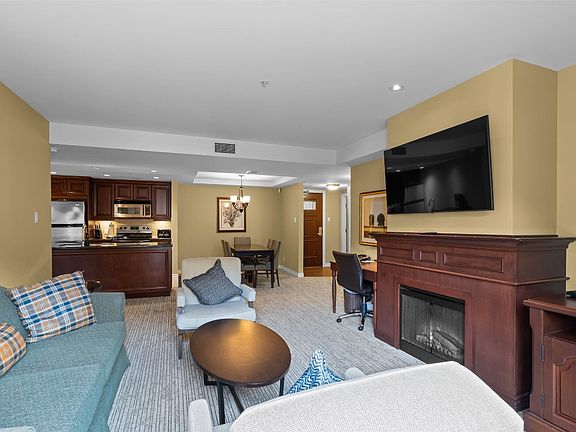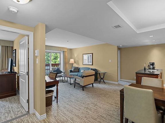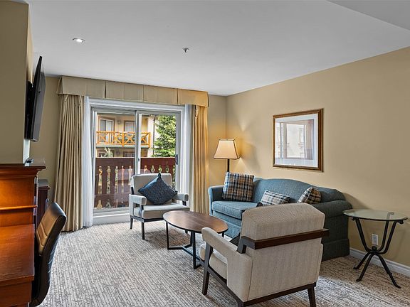 Turn key quarter share ownership in the Residences at the Sun Peaks Grand. Located for true ski-in/ski-out access in the vibrant center of Sun Peaks Resort. This unit boasts one of the largest floor plans available, highlighted by the most expansive balcony in the complex, providing stunning views of the Village Stroll. The full kitchen features elegant granite countertops and stainless steel appliances, opening to a generous dining and living area complete with a welcoming fireplace. Designed for comfort, it easily sleeps six with a sofabed, a king-sized bed in the primary bedroom, and two twin beds in the second.