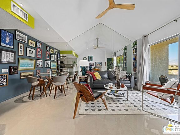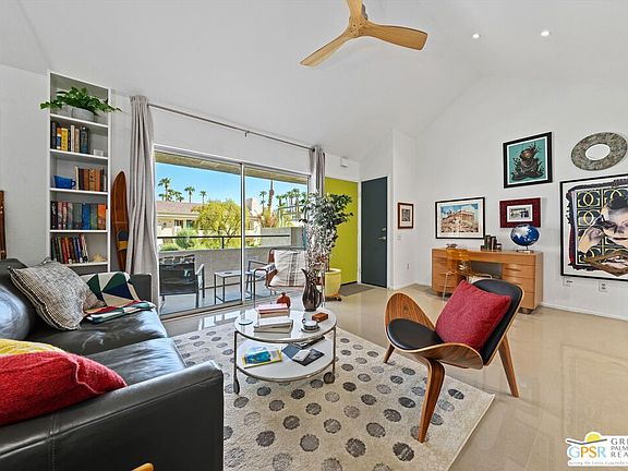 Welcome to Candlewood Villas I, a quiet, gated community conveniently located on the border of Cathedral City and Palm Springs. This charming complex features 64 homes, two pools, hot tubs, and a private tennis court. This well-maintained one-bedroom, one-bathroom condo offers fee simple ownership (you own the land) with low HOA dues. Enter through a custom privacy gate to a front balcony with mountain views. Inside, the bright living area boasts vaulted ceilings, a dramatic mirrored wall, and sleek porcelain tile floors. The open kitchen is equipped with stainless steel appliances and includes a breakfast bar for casual dining. The spacious bedroom features sliders to a private balcony overlooking lush greenery. Additional highlights include newer kitchen appliances, washer and dryer, and an upgraded HVAC system. With its blend of privacy, comfort, and convenience, this Candlewood Villas I home is a rare find in the heart of the desert. Don't miss the opportunity to make it your own.