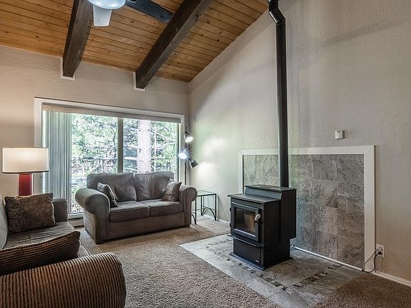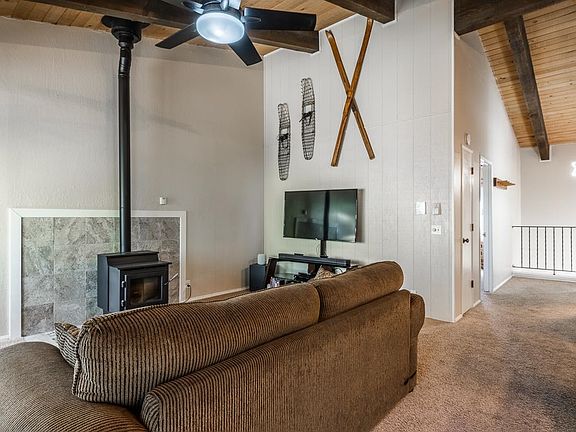Discover this 4-bedroom, 2.5 bath townhome located in Chateau De Montagne complex and nestled in the heart of Mammoth Lakes. This move-in ready and quiet home has no one above you are below you. The floor plan boasts comfort, style, and convenience. Easy access -- pull right in to the complex and park directly in front of the condo. There are 3 bedrooms, 1.5 bath and laundry closet downstairs and upstairs are the living, dining, kitchen, another bedroom and bath. The open living area upstairs features the kitchen which has been updated with new countertops, sink, fixtures and flooring. The living room centers around a new pellet stove and tile hearth. Off the dining room sliding glass doors is a large deck with views to the grassy area and common area where you will find the swimming pool, hot tub and sauna. Another sliding glass door downstairs offers easy access to the open area in back. Additional updates include new lighting fixtures, ceiling fans in the living room and primary bedroom and new countertop in the upstairs bath. Smart thermostats control 5 baseboard heaters allowing control via a phone app. The condo has plenty of interior storage and is being sold mostly furnished. The 1715 square feet includes the garage to bedroom conversion which was completed by the previous owner. Free town shuttle stop directly in front of Chateau De Montagne complex. The complex is close to the bowling alley, Mammoth Creek Park with the soon to open Community Center and ice-skating rink, as well as Vons grocery store, local restaurants and bars.