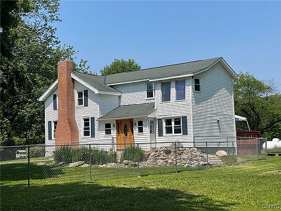 OPEN HOUSE!! SATURDAY 7/8-12/4 P.M. Located in the Weedsport school district, 2 miles from the NYS thruway! Country living, close to ALL OF THE AMENITIES! 4 bed/2 full bath on 6 GORGEOUS ACRES! Blacktop driveway w/detached 3 car garage, NEW workshop built in 2020, insulated, w/ power and poured concrete floor. Large outpost building, grape vines behind the garage. There's a fully fenced in the front yard perfect for the dogs to run free! Don't forget your 5,500-gallon Koi Pond complete with waterfall, filtration system, and beautiful Koi. Coming into the foyer, you are greeted with an open kitchen/dining room and full bath. There's a bedroom off the living room that is currently used as an office. All appliances are new in the last four years! Have dinner on the back deck, as you enjoy the wildlife on the serene landscape. Upstairs, the primary bedroom is huge with its own recently remodeled bathroom and 5x9 Sunroom overlooking the KOI pond. The 2 upstairs bedrooms are spacious with large closets. Newer mechanicals boast a well-maintained home. Furnace/Central Air in 2021, water system in 2017, Hot water tank in 2017, and more! Don't miss the opportunity to own this beautiful home!