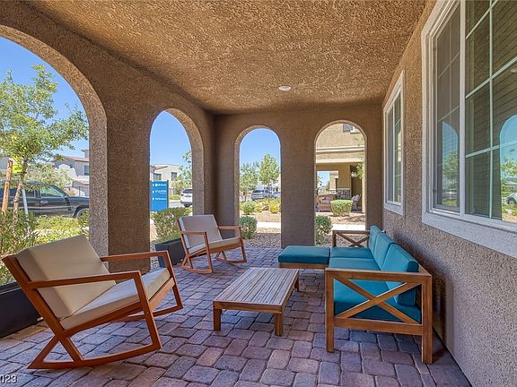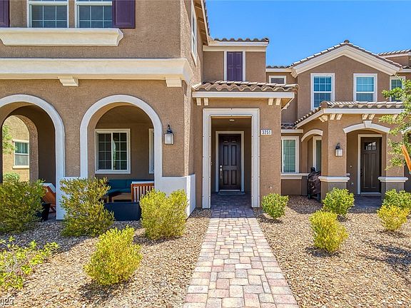 WOW! Highly upgraded Inspirada 1842 sq ft Townhome built in 2020 with OWNED SOLAR! Beautiful covered front patio with pavers and elegant archways. As an end unit, the extra windows and high ceilings give the great room a light and airy feeling. Beautiful engineered wood flooring and porcelain tile downstairs. The gourmet kitchen features custom cabinets with 42"uppers, crown molding, large island and upgraded SS appliances. Perfect for the inspired chef or entertaining friends around the large kitchen island! All SS appliances and reverse osmosis are included. The home has R15 insulation in the walls and R38 in the attic. Surround sound & security wired. CAT6. Primary suite features a custom closet and the primary bath features an extended shower with bench seat. Wood blinds and ceiling fans/lights throughout. Fully finished garage with epoxy floor. Water conditioning system and tankless hot water heater. Full list of upgrades & 3 months NV energy bills available. Impressive!