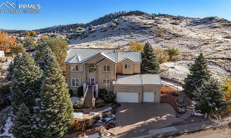 Nestled in a quiet community near the Colorado Springs Country Club, this exquisite custom 2-story home with a finished basement offers unmatched comfort & sophistication. The main level boasts a wide open floor plan with rich, newer hardwood flooring, soaring double-height ceilings, & elegant formal living and dining rooms featuring stunning Pikes Peak views. The gourmet kitchen is a chef’s dream, showcasing sleek stainless steel appliances, a spacious island, instant hot water faucet, a well-sized eat-in nook with walk-out, & useful pantry storage. The inviting great room is highlighted by a cozy gas fireplace with a striking stacked stone feature wall. Completing the main level are a private office with custom built-ins, adjacent half bath & a convenient laundry/mudroom. Upstairs, the primary suite is a luxurious retreat, featuring a double-sided fireplace shared with a spa-like 5-piece master bath, a spacious walk-in closet, & a private office with even more captivating views. Two additional charming bedrooms & a well-appointed full bath are connected by a dramatic catwalk. The versatile finished basement offers multiple recreational areas perfect for TV, games, crafting, or exercise, along with a convenient wet bar with appliances included. It also includes two generously sized bedrooms & another full bathroom. Situated on a sprawling, nearly one-acre lot, the backyard is an entertainer’s paradise with a stamped concrete patio & built-in grill, with no neighbors behind! The unique 3-car garage offers taller ceilings, creating space for a functional work area platform just outside the mudroom, complete with additional storage solutions. The newer coated metal roof & lower maintenance stucco exterior ensures peace of mind. Backing to 730 acres of pristine city parkland, this property offers serene views of majestic Pikes Peak to the west & scenic Palmer Park to the east. Combining elegant design with remarkable functionality, this home is truly one-of-a-kind.