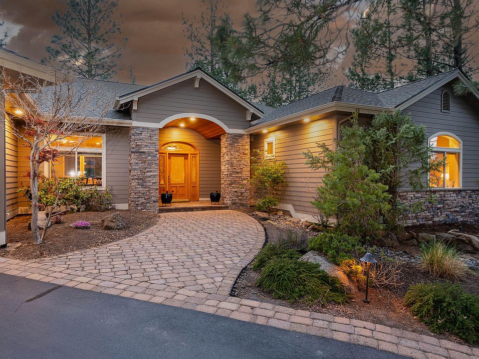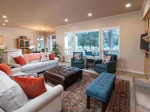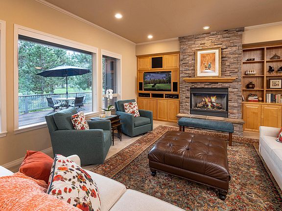 Single story spectacular home on the 7th tee box of Awbrey Glen. Great rm has built-in cabinets, gas stone fireplace & a wall of windows allowing wonderful natural light overlooking the massive deck & golf course. Gourmet kitchen includes center island, new quartz counters, 6 burner freestanding stove, pantry & large breakfast nook w/ views of your backyard. Formal dining room is open to the kitchen & great rm. Primary bedroom is just a hidden sanctuary with room enough for sitting area, ceiling fan, 2 separate walk-in closets, dual vanities, sunken tub, separate shower & door leading to outside deck. Spacious guest suite faces front of house with walk-in closet & window seat. 3rd guest bedroom has been converted to an office with built-in desk which can be easily converted back. Enjoy outdoor entertaining on your fenced deck for morning coffee or a BBQ. Individual laundry/mud rm with sink. 3 car garage has built-in cabinets. And much more!