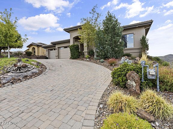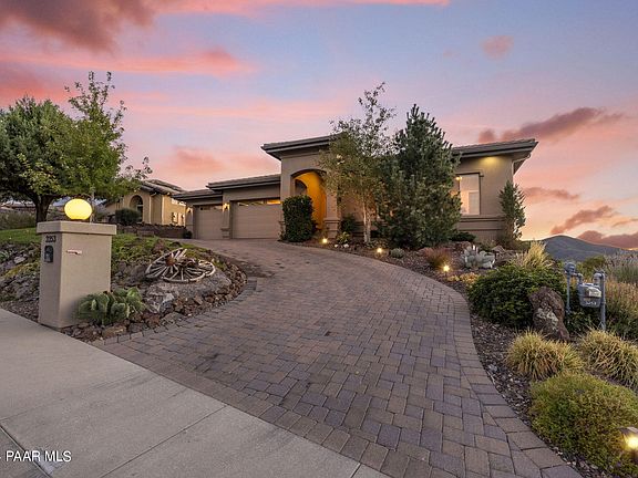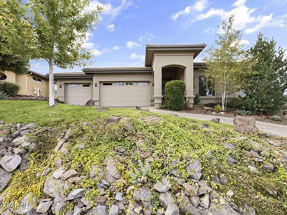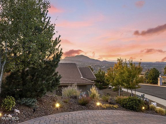 Exquisite home in Mystic Heights @ The Ranch. Awe inspiring views of Granite Mt, Thumb Butte and the dazzling city lights! No custom detail was spared. From over sized baseboards, premium grade engineered hardwood floors, lux custom gas fireplace, solid wood cabinets, 10 ft ceilings, 8 ft doors, leathered granite counters, circulator on water heater, tile roof, M&I windows, sprayed foam insulation, all LG appliances and more. This 3 bed, 2 bath, 2003 sq ft home is truly the epitome of luxury. Take in the amazing views from your paver lined back patio; complete with an al fresco dining area. Walking paths carved throughout the property adorned w Deodar Cedars, Colorado Blue Spruce, Flowering Peach, Cherry & Plum, Desert & Purple Willow. This home offers an experience like no other!