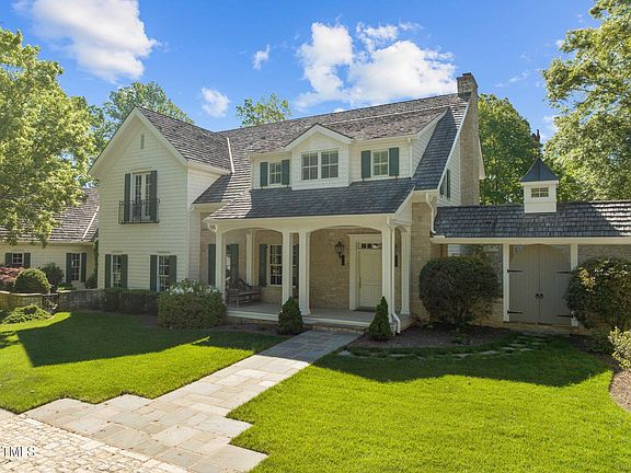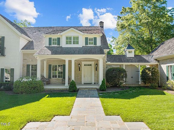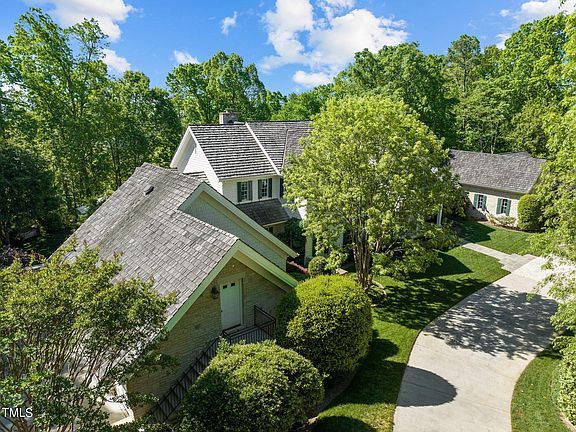 Situated near the highest point from Chapel Hill to the North Carolina coast, this one-of-a-kind home with mesmerizing views is a seamless blend of quiet luxury and relaxed elegance. A prime example of the enduring value of exceptional real estate. With a million dollar view to Jordan Lake, there is over 7,700 sf of living space to enjoy shared time or personal reflection. Located in the coveted Highland Pond neighborhood of Governors Club, this unique stone and cedar shake home epitomizes the timeless value of quality design, stellar construction and superior craftsmanship. The home was completed in 2001 by Brightleaf Development, one of the premier builders in the Triangle, and designed by the noted architect, William Hirsch. The main house spans nearly 6,600 sf on two levels, with an additional 1,150 sf in the adjacent guest cottage. The curated gardens amid the tucked-away stone patios and secluded brick courtyards create visual masterpieces viewed from inside the home and from the multiple outdoor living and entertaining venues. The captivating home features soaring ceilings, oversized windows and six-inch wide plank wood floors, reclaimed from a Jim Beam distillery in Kentucky. A gracious stone-walled foyer opens to the expansive living room with 12-foot ceiling, wall of windows and a quartet of French doors leading to exterior venues. Architectural features include the twenty-three foot ceiling in the dome-lit Gallery, a wood-paneled library with fireplace, formal dining with butlers pantry and grand sweeping staircase to the upper level. Enjoy ten to twelve-foot ceilings throughout. Beyond the Gallery leads to the ample kitchen that flows to the Amdega conservatory, imported from England with glass on all sides including the ventilated ceiling. The garden room and adjacent greenhouse are additional unique rooms with amazing views and access to the gardens. The primary bedroom is an oasis of serenity on the second level, with amazing distance views to the southeast, access to an open air deck, and significant ensuite with step-in tiled shower, soaking tub, three closets, plus a personal laundry. The second bedroom features a sitting area, two closets and an ensuite with sauna and access to additional significant unfinished storage (and potential living) space. The third bedroom is currently used as a private retreat and office. The one-level guest house is accessed from the main home from a breezeway off the foyer. Guests and family can enjoy their privacy with two ensuite bedrooms and shared living and dining space. The outdoor living spaces provide many options for al fresco relaxing and entertaining from the bluestone patios to the oversized screen porch with an 11 foot ceiling and stone fireplace.