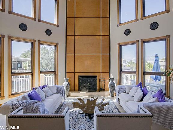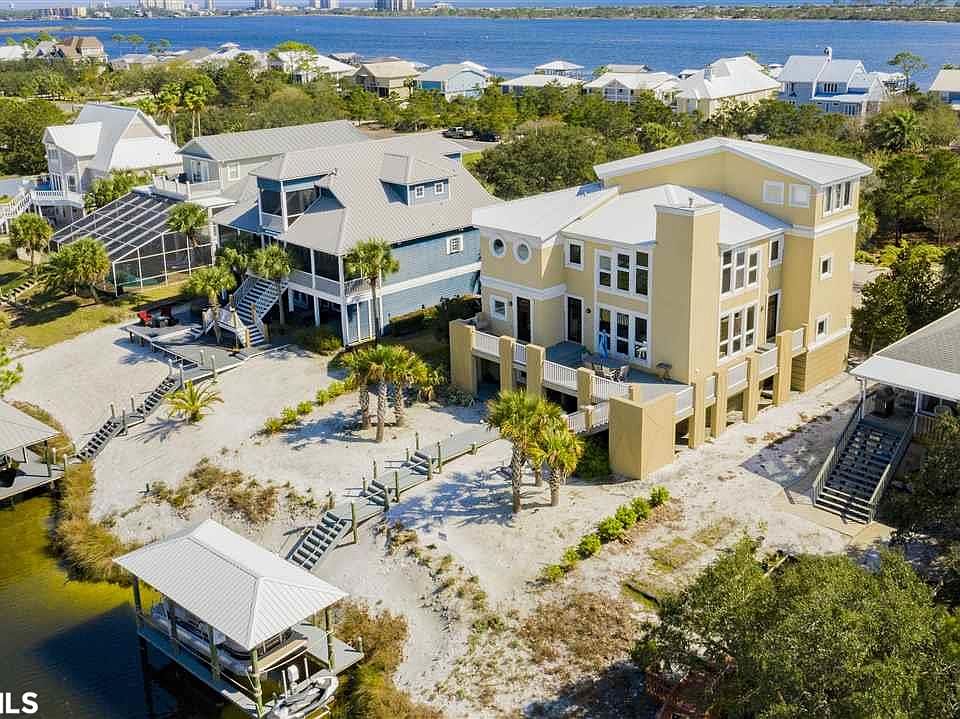 This spectacular 4-level quiet waterfront Ono Island home features beautiful Belize mahogany stairways trimmed with rare exotic tropical wood and thoughtful construction. Oversized rooms, grand foyer, hydraulic ELEVATOR, gas fireplace, arched doorways, wide hallways, a front door that immediately impresses (it's kind of like entering a palace). Downstairs leads to a library, exercise room, and spacious office with bar, garages and climate controlled indoor kennel. Though very spacious, the scale and flow of this stunning home foster comfort with warm colors, handmade mahogany louvered doors, new Bosch appliances, travertine and mahogany flooring throughout. See floor plan under Documents. Deep covered porches from every level embrace indoor/outdoor island lifestyle and offer front row seats to ospreys diving for fish and magnificent sunsets. All of the touches come together to form a home that is as unique and creative as the family who lovingly put it together. You will be thrilled to call this home.