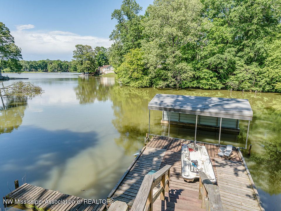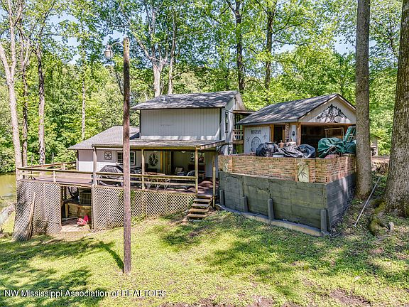 Lovely three bedroom, two bathroom home right on the lake! This home has been renovated! The large living room boast beautiful lake views and a brick fireplace and mantle. The kitchen features granite counter tops, plenty of cabinet space, granite countertops, and breakfast bar. The spacious master bedroom features plenty of space for all of your furniture and an attached master bathroom. There are two more large bedrooms and another full bathroom. In the back of the house, there is a wrap around porch and a patio area. Additionally, there is a covered patio with lake views. The concrete patio area will have tile pavers put on it. Also there is a deck and private boat dock and a boat shed. This is the perfect lake getaway with amazing waterviews!