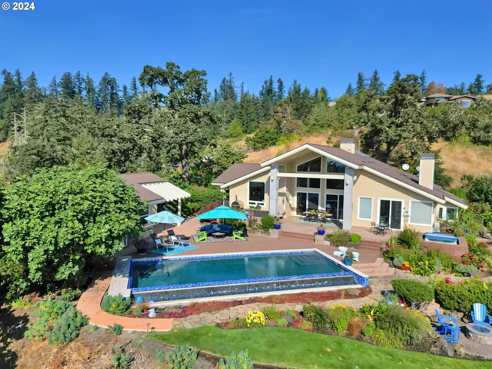 "The one with the million dollar view"... it will make you say, "man, it just don't get no better than this". This custom built beauty w/expansive stone fireplace is an entertainer's delight. Sellers just had a nearly $300K kitchen/living renovation completed 1 year ago. This is your opportunity for turn-key mostly main-level living with separation of space for guests & hobbies. The current owners use former wine chiller rm as a second lg walk-in pantry. Sellers will return wood wine storage to the space, if so desired. Kitchen boasts custom walnut cabinets, quartzite countertops, Sub Zero refrigerator, separate Sub Zero Freezer, built-in walnut panel dishwasher, ice maker. Ample storage below chef's prep island with waterfall quartzite countertops, six burner Wolf range w/griddle & double ovens, toe kick lighting, custom focal point range hood, vaulted ceilings, picture windows w/auto shades, pot filler, floating shelves, bookshelves & display cabinets. Loft is currently used as an office/craft room/guest space. The two bedrooms/bathrooms on main level make for easy living. The guest house quarters has bathroom w/shower, kitchenette space with small fridge & built-in drawer dishwasher. In the primary bedroom, you will find a second fireplace & more of that million dollar view, a spa-like bathroom w/double shower, sauna, second jetted tub and walk-in closet. Relaxing in the hot tub or infinity pool is the stuff dreams are made of. There is a covered front & back patio to keep you protected year 'round. The home was designed by the original owners w/every detail considered to maximize the stunning views. The HOA is used in all the best ways, great neighbors & sunrises to stop you in your tracks. Gated community w/5 acre parcels & exceptional privacy. Plenty of parking for guests, as well as a greenhouse & dog kennel. In addition to the guest house you will find a pool pump room, pool changing rm, a shed & wood storage. This home is gorgeous.