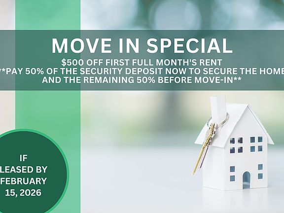 - Special offer! **MOVE IN SPECIAL! $500 OFF FIRST FULL MONTH'S RENT IF LEASED BY FEBRUARY 15, 2026 **PAY 50% OF THE SECURITY DEPOSIT NOW TO SECURE THE HOME AND THE REMAINING 50% BEFORE MOVE-IN.**