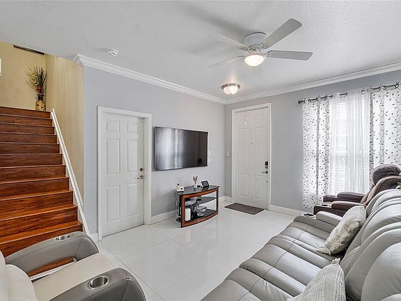 Experience comfort and style in this 3-bedroom, 3-bathroom townhouse, offering crown molding throughout for an elegant touch. The kitchen is a chef's dream with high hat lights, stainless steel appliances, white cabinets, and a stunning Calacatta quartz countertop. Downstairs, you'll find sleek 24x24-inch tiles, a full bedroom and bathroom, and an upstairs loft that's perfect for a home office or play area. The townhouse's Spanish tile roof and paver driveway add to its curb appeal. Inside, five ceiling fans and a hanging chandelier create a warm and welcoming atmosphere, while accordion shutters provide security and peace of mind. This well-designed property is a fantastic opportunity for those seeking a beautiful and functional home. Schedule your tour today!