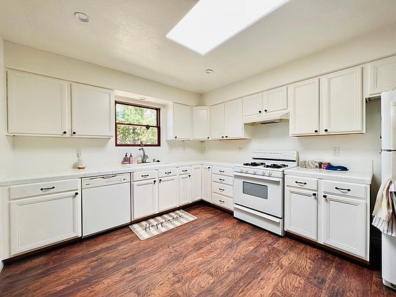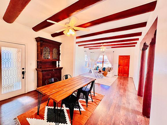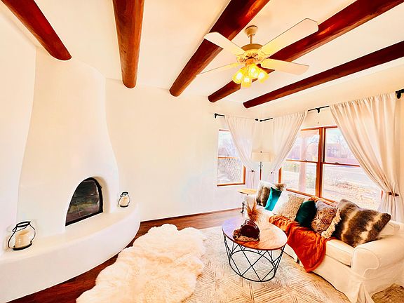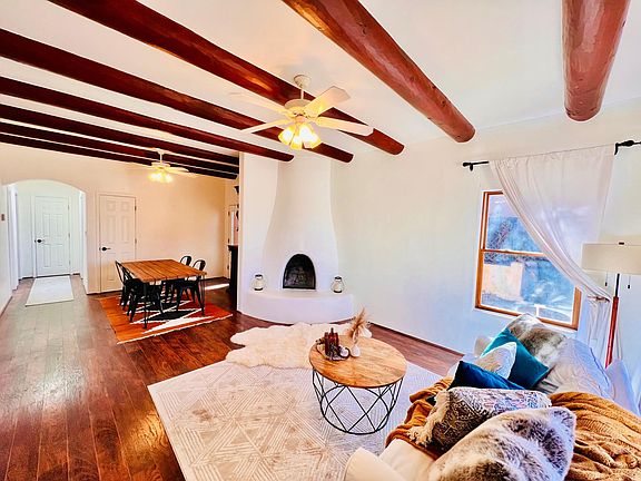 Lovely adobe style home with a xeriscaped yard and fenced in backyard with plenty of raised garden space for those with a green thumb. The backyard patio has a beautiful stone fireplace for lovely fireside evenings. Includes full washer/dryer and kitchen, kiva fireplace, mini split air conditioning, and attached 2-car garage. Beautiful, quiet neighborhood with several walking/running trails less than a block away. Less than 10 minutes from the Plaza and an approximate 45-minute commute to Los Alamos and White Rock National Labs.