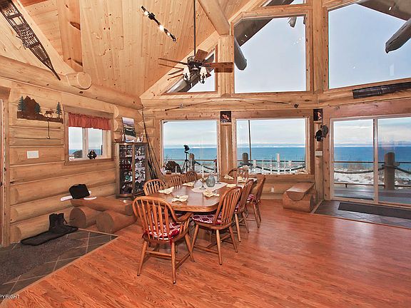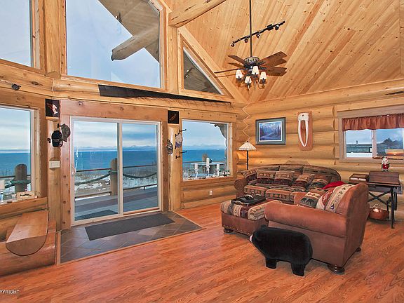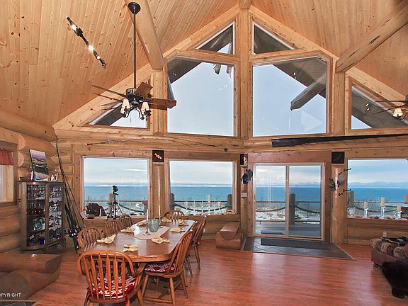 SALMON, SALMON, Everywhere!! Salmon, the size you would love to catch, artistically adorned in this LOVELY log home with 180 degrees of delightful, unobstructed views of all the volcanoes across Cook Inlet. This special home sits on 2.7 acres insuring lots of parking for those necessary Alaskan toys. 3 floors and 3,410 sq. ft. includes 2BR/3BA, a walkout basement (or additional bedrooms). Radiant heat keeps everyone toasty during our colder winters. Attention to detail can be seen throughout this well built house from the log work to the wrought iron artwork in the staircases and kitchen. Truly, it is one of a kind and a MUST see if you are looking for a unique home with the amenities Alaskans hold dear.