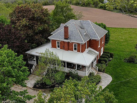 Expansive Acreage: With over 95 acres of pristine land, including approximately 69 acres of fertile workable fields and 23 acres of wooded areas surrounding a stream, This property unfolds a vast array of possibilities. A picture of classic charm, this charming homestead welcomes you with stamped concrete walkways and a 3/4 wraparound porch—a perfect perch to savor panoramic views of the surrounding beauty. Discover a versatile workshop 20ft by 50ft fully insulated and heated workshop, ready to accommodate your projects and hobbies, providing a space where creativity and craftsmanship converge. Unwind and entertain under the open skies with an outdoor stage and firepit—a captivating venue for hosting gatherings and creating lasting memories with family and friends. Step into the heart of the home, where an updated kitchen and spacious pantry set the stage for culinary delights. The main floor unfolds with a cozy living room featuring a gas fireplace, main floor laundry for convenience, and a delightful 3 seasons room with its own entrance. Ascend to the second floor, where a large master bedroom awaits, complete with an attached nursery transformed into a luxurious walk-in closet. Two additional generously sized bedrooms and a den/office offer flexibility and space for all your needs. On the third Floor a expansive Loft bedroom with jetted tub, toilet and sink. Descend to the basement, where a dry bar in the fully equipped games room invites laughter and camaraderie.