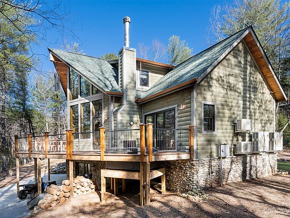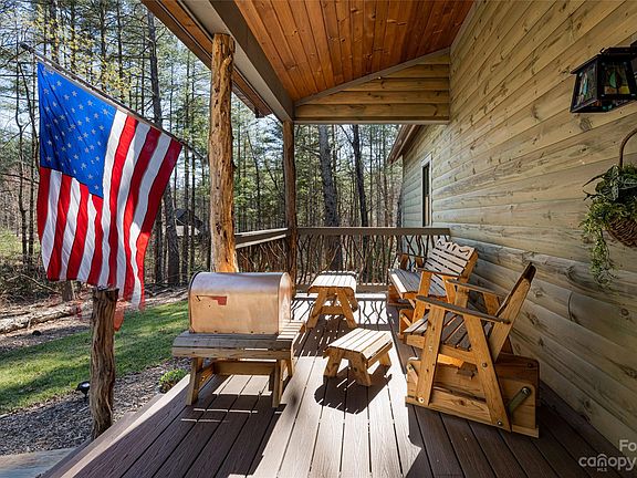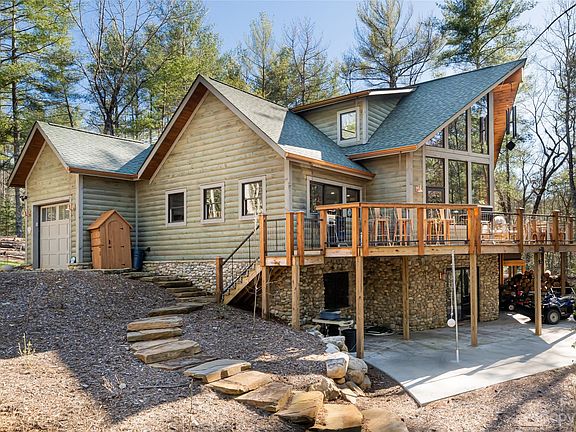 Upscale cabin in the highly sought-after 1780 at Lake James. Impeccable attention to detail includes vaulted wood ceilings throughout, copper sinks and tub, cork accent wall in the kitchen, mountain laurel railings, and high-end finishes. This newer construction home offers a quiet, peaceful location with the amenities of Camp Lake James and a boat slip. The 1.21-acre property adjoins the Overmountain Victory National Historic Trail and a natural pond with picnic areas. Inside the cabin find an open concept floor plan featuring a two-story great room with floor-to-ceiling windows, large chef's kitchen with island and walk-in pantry, main floor primary suite with direct access to the back porch and hot tub, and wood-burning stone fireplace with gas starter. The deck spans the entire back of the house, providing wooded views from the sunken hot tub. Access the conditioned basement through a cleverly hidden passageway behind a bookshelf. Bonus loft area/office/flex space.