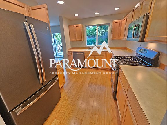 Natural lightLarge deckLaminate flooringFenced in backyardLight colored paintStainless steel appliances