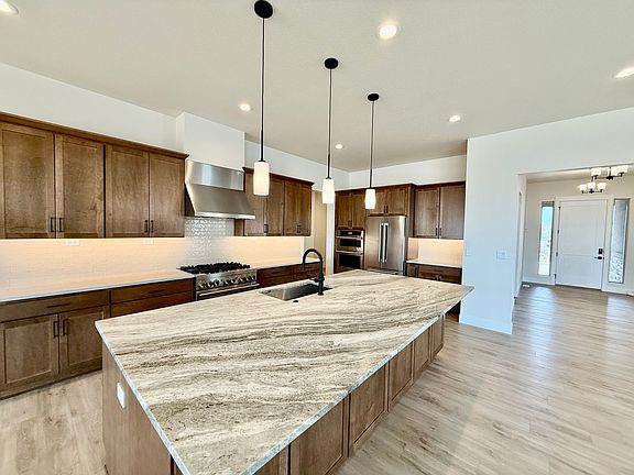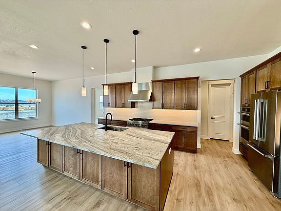 The chef's kitchen is a true showstopper, featuring quartz countertops, a leather-finished granite island, luxury Jennair stainless steel appliances, a double oven, a farm sink, a large pantry, and a heat lamp above the gas rangeall designed for both gourmet cooking and stylish entertaining. The grand sliding glass doors open to a private patio, ideal for taking in the serene Colorado evenings.