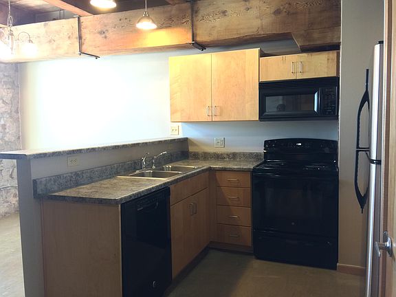 Adorable downtown loft, with washer and dryer, stained concrete floors, exposed ducts, and carpet and just the bedroom. Building has an elevator and ample off street parking. Landlord pays water, sewer, trash, lawn and snow (Photos of similar unit, may not be the unit you tour).