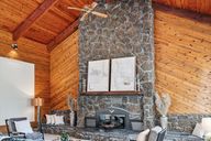 - Description: 2 Story Wood Beams And Wood Clad Ceiling, Stacked Stone Fire Place, Arched Windows, Tiled Wet Bar, Ceiling Fans