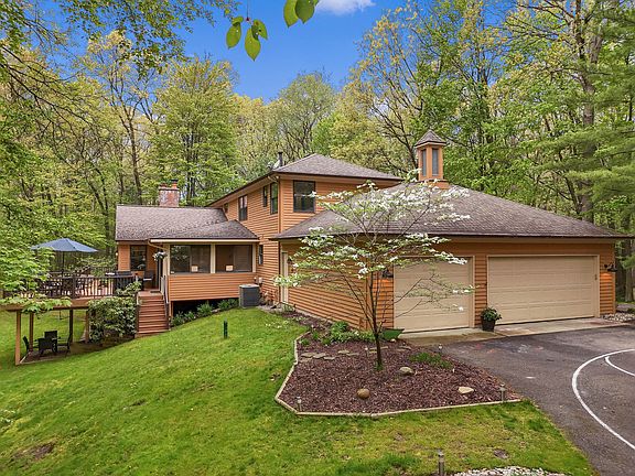 Tucked away on 2.3 private, park-like acres in one of Ada's most desirable neighborhoods, this impeccably maintained and extensively updated 2-story estate offers over 5,000 sq ft of refined living space in the Forest Hills School District. This stunning home perfectly blends timeless design with modern convenience and luxury. Inside, you'll find 4 spacious bedrooms, 3 full bathrooms, and a powder room, along with multiple formal and casual living and dining areas—all designed with generous proportions and a thoughtful layout. Every bedroom includes custom walk-in closets with built-ins, while the home itself offers extensive storage throughout. The heart of the home is a fully remodeled chef's kitchen featuring top-tier Wolf appliances, a Sub-Zero refrigerator, three ovens, a steamer, apron-front farmhouse sink, and an additional prep/veggie sink. Undermount electrical outlets and designer lighting enhance functionality and style, while an extra beverage fridge offers convenience for entertaining. Adjacent to the kitchen, the Great Room impresses with cathedral ceilings, a dramatic brick fireplace with a new insert, and sliding doors leading to a cozy screened porch, perfect for enjoying the serene natural surroundings. Upstairs are all four bedrooms, including the luxurious primary suite, complete with a spa-like bath. The walkout lower level adds even more space with a second kitchen, a large game area, a family room with gas fireplace, a full bath, and more storage.