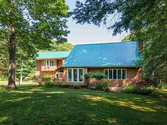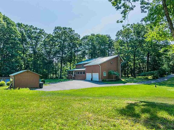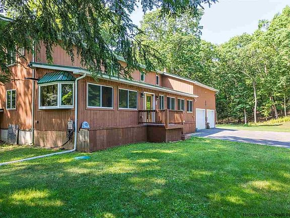 Minutes to Uptown Kingston and the NYS Thruway, this well-maintained contemporary on 1.44 park-like acres is close to all the action of one of the Hudson Valley's hottest commercial districts but offers remarkable seclusion and privacy, too. Surrounded by woods at the end of a quiet cul-de-sac, the house provides seamless indoor-outdoor living with an extra-large kitchen and 40-foot den opening to an in-ground swimming pool that's open and ready to enjoy. Inside, the spacious, cathedral-ceilinged living room and dining room project an open, contemporary vibe that could be stylishly carried further throughout the house. Other features include a standing-seam metal roof, a first-floor bedroom with its own full bath, and a roomy master bedroom suite upstairs with an enormous en suite bathroom. Major storage space is close to hand on all levels, including the enormous finished basement and two sheds.