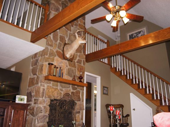 COUNTRY LIVING AT ITS BEST! This gorgeous pondarosa is nestled off the road on its own 3.12 acres. Beautiful flowering trees and natural landscaping surround a spacious 4 bedroom, 3 1/2 bath home. A huge expansive wood deck begs for large chairs and potted plants! This truly well built home has a floor to ceiling stone fireplace, knotty wood ship lap in dining room, ample storage, laundry room, upstairs office, with two bedrooms up and two down. Check out the outside storage with roll up door to house all your equipment. This is genuinely the country home that doesn't come along every day. Five minutes from the interstate! Make your appointment for your private showing!