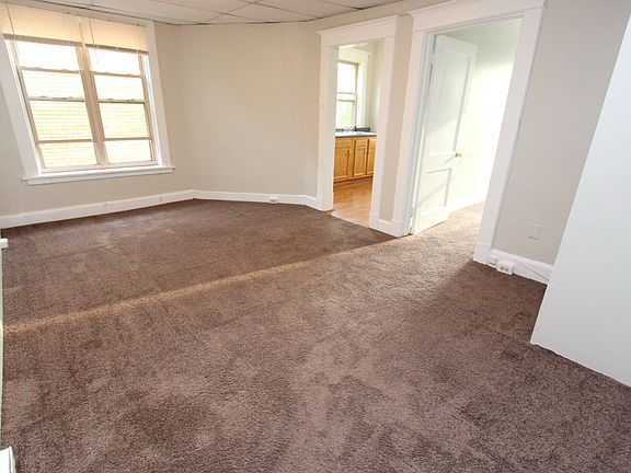 Inside, you'll find a charming kitchen with room for a dining table, a generous living area, and four good-sized bedrooms. The apartment features comfortable wall-to-wall carpeting and is painted in a modern, neutral gray, making it easy to personalize and feel right at home.