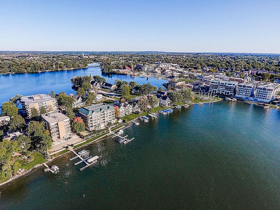 Absolutely meticulous second floor unit in La Belle Shores! You will fall in love with the open concept floor plan, perfect for entertaining! Spectacular views of the lake and sunsets, private boat slip and prime swimming frontage. Relax on the large balcony with awning and enjoy music as it floats through the air from the band shell. Walk downtown to all of the restaurants and shopping. The kitchen is open to the generous living and dining room areas. Master bedroom suite with private bath and walk in closet. Second bedroom has access to second full bath. In unit laundry is a huge plus! Newer carpeting throughout and every inch of this condo has been lovingly maintained. Sellers would include many of the furnishings if buyer desired. 1 underground parking space and 1 outdoors,