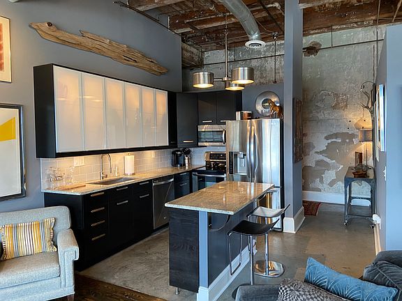 Located in a former John Deere Factory built in 1914, this 2-bedroom, 1-bathroom historic Castleberry Hill loft is within walking distance from Mercedes-Benz Stadium, State Farm Arena, The Georgia World Congress Center, Centennial Olympic Park and one of the most significant developments South Downtown has ever seen - Centennial Yards. A renovated, modern kitchen with granite countertops, island and matching stainless steel appliances opens up to a large living and dining space with industrial-sized windows, vaulted ceilings and exposed, original beams. Floors are a mix of original, refinished heart of pine and polished concrete. Amenities include a gym, rooftop deck and laundry room. Fourth floor unit with one gated, secure parking space. Agents welcome. For a private showing, text or call Chad Parker at number listed below.