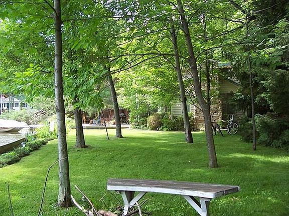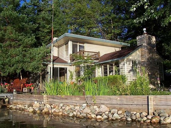 Nicely maintained 3 bedroom 2 bath home, located on a dead end road w/135 feet of sandy water frontage on all sports Lake George. Enjoy the private, secluded park like setting, nice and level to waters edge, large entertaining deck w/pergola, includes newer appliances, laundry facilities, some furnishings, removable dock, floating dock, and hot tub. Beautiful views from every window. Cozy natural gas fireplace and forced air furnace, screened in porch. 2 bedrooms upstairs, one w/a private balcony off master & 1/2 bath as well as 1 bedroom & full bath on main floor, there is a tub, sink & toilet in bathroom w/stand up shower in utility room. Hardwood flooring under carpet in living room. New roof on main home fall of 2015. Needs some updating, but has lots of potential and is in great condition. There is also a 2 bedroom, 1 bath guest house(loft used as 2nd bedroom) w/attached drive-thru garage & pole barn across the street that can be purchased for an additional price.