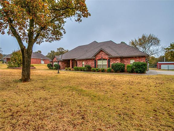 Updated home in a quiet neighborhood with trees. Upgrades include Engineered Wood Flooring in Entry, Living Room, Formal Dining, Master Bedroom, Granite Counter Tops, 5' Master Shower, & Plumbing Fixtures. It has an open Floor Plan, Crown Molding, Custom Oak Cabinets, Loads of Storage Space, Pantry, & Subway Tile Backsplash in the Kitchen. Master Bath has Jetted Tub, Walk-In Closet, 5' Ceramic Tile Shower, & H & H Sinks; The Hall Bath Vanity has 2 Sinks. A 24x30 Insulate Metal Workshop with an Overhead Door & a Walk-in Door & has electric & cement floor & is located in the Back Yard. Very well maintained home. The home is located approximately 1 mile South of the HE Bailey Turnpike Spur. Easy access to Norman, OKC, Mustang & Chickasha. A must see!