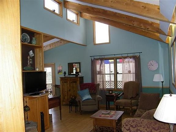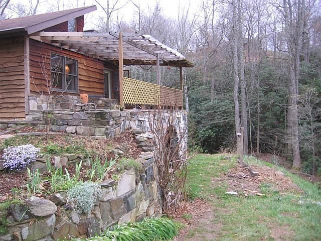 -Mountain siding coveres this gem in the woods. Beautiful stone work of native stone in the retaining walls, columns, and fireplaces. Wood burning fireplaces in great room and basement. Both fireplaces have walls of stone to add to the appeal of the room.Bedroom on main floor and two down. Great room/dining/kitchen with laminate wood flooring. Outside building with electric and solar passive greenhouse beide houe. Great winter views.Two lots