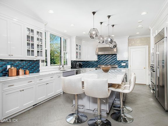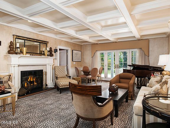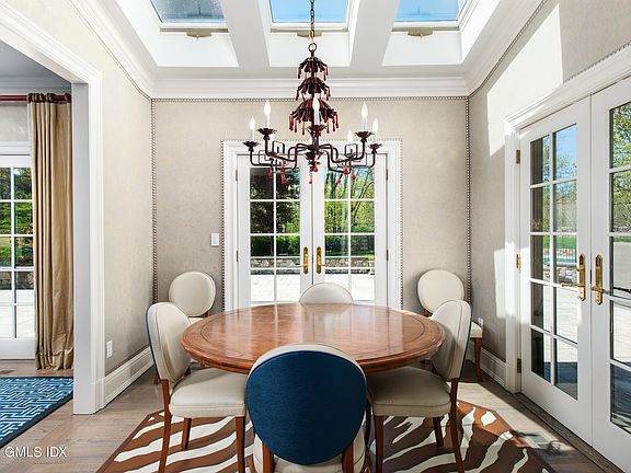 Grand Georgian Colonial set on four manicured acres, provides the ideal retreat minutes to downtown Greenwich. Easy living flows from the formal spaces, gourmet kitchen and private office to the large stone patio and gorgeous grounds with a 120-year-old grand Copper Beech tree as an exquisite backdrop against the outdoor kitchen and heated pool. The upper level features a master suite with balcony, sitting area, private office, fireplace, and spa-like bathroom as well as a pub-inspired parlor. Four bedrooms and a sunlit third floor playroom, for kids and adults alike, complete these upper levels. First floor amenities include a staff bedroom suite, pool bath, mud room and 4-car garage. The lower level offers an entertaining bar, movie theatre room, gym and sauna. Possible tennis court.