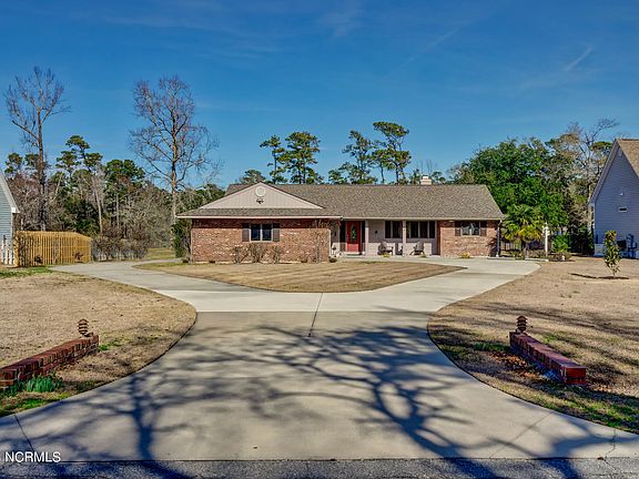 Great opportunity to own this charming 3 BR, 2 BA brick ranch home on approx. .45 acre golf course lot in the desirable neighborhood of Belvedere. This bright & airy home w/ it's open concept floor plan & serene golf course views has so much to offer. Retreat to the spacious great rm w/ LVP flooring, a beautiful brick wood burning fireplace, wet bar, & a couple of sliders & windows to enjoy the views. The kitchen is just awaiting your personal touch, featuring cabinets, Formica countertops, vinyl flooring, stove, dishwasher, refrigerator, microwave, a breakfast bar & large breakfast nook area, you will be ready to create those special family meals. Home also offers a formal dining room. The owner's bedroom has bathroom access w/ a double sink vanity, tile flooring & tile walk in shower. The hallway leading to the 2 additional bedrooms has a pocket door to close off hallway for privacy, along w/ a guest bath w/ vinyl flooring, solid surface countertops and a tub/shower combo are perfect for family & guests. Large laundry & mud room combination w/ soaking sink, built in ironing board, water filtration system, & vinyl flooring. Back yard features screened in porch, large deck area with built-in seating, & pergola w/ wonderful views of 6th fairway & green. It is simply perfect for a family BBQ & entertaining while you create new memories w/ family & friends. The ICWW is nearby, you'll relax & enjoy your morning coffee & outdoor activities while taking in the salty coastal breezes. Well water for irrigation & 2 car side load drive through carport make parking an ease. Attached workshop heat & air square footage is not included in listing htd sq ft. Located nearby to public boat ramps and Harbor Village Marina. Topsail school district and close to shopping, restaurants, medical facilities, historic downtown Wilmington, & Topsail Island beaches. IronClad golf course amenities available with membership, inquire w/ pro shop.