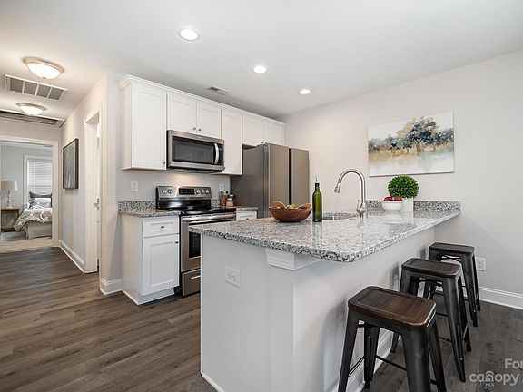 Stainless steel appliances, including a fridge and stove, complete this contemporary kitchen. Don't miss the opportunity to own this stylish home near the vibrant downtown area of Rock Hill.