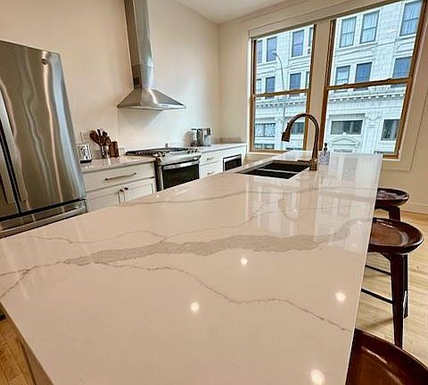 Sleek quartz countertopsNew big windowsAbundance of natural lightElegant kitchenEfficient hvac systemOriginal hardwood floors