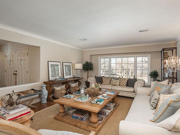 This all brick ranch-style home is nestled on a sprawling one-acre lot in Cherry Hills Village, surrounded by lush greenery and mature trees, providing a sense of privacy and tranquility. The exterior of the house is characterized by a cottage-style architecture with a welcoming front porch. Upon entering the home, you're greeted by an open and inviting floor plan designed for main floor living. The interior exudes warmth with hardwood floors, neutral tones, and large windows that allow natural light to flood the space. The family room is centered around a fireplace, creating a cozy focal point, while the adjacent dining area is perfect for family meals or entertaining guests. The kitchen is well-appointed with modern appliances, granite countertops, and the breakfast nook overlooks the scenic backyard. The primary suite is a retreat in itself, featuring a spacious bedroom with an ensuite bathroom and a walk-in closet. Three additional bedrooms on the main floor and 2 bathrooms provide comfort and convenience. The finished basement adds an extra dimension to the living space, offering versatility for various activities that include a spacious media room with a built-in entertainment center and 2 guest bedrooms with a full bathroom. The basement also boasts ample storage space in the unfinished space under the primary bedroom. The property's one-acre lot allows for expansive outdoor living spaces. The back patio is ideal for al fresco dining and entertaining, overlooking the well-manicured lawn and garden areas. This home embodies the timeless appeal of a cottage style with modern amenities, creating a harmonious blend of comfort, elegance, and functionality on a generous one-acre lot. Remodel plans are included, create your dream home in this coveted area where homes sell upward of $5mil+.