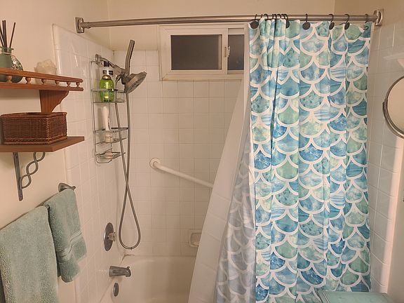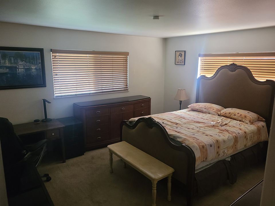 Large furnished room with bed, dresser, and work desk, includes full private bathroom down hallway. All utilities included