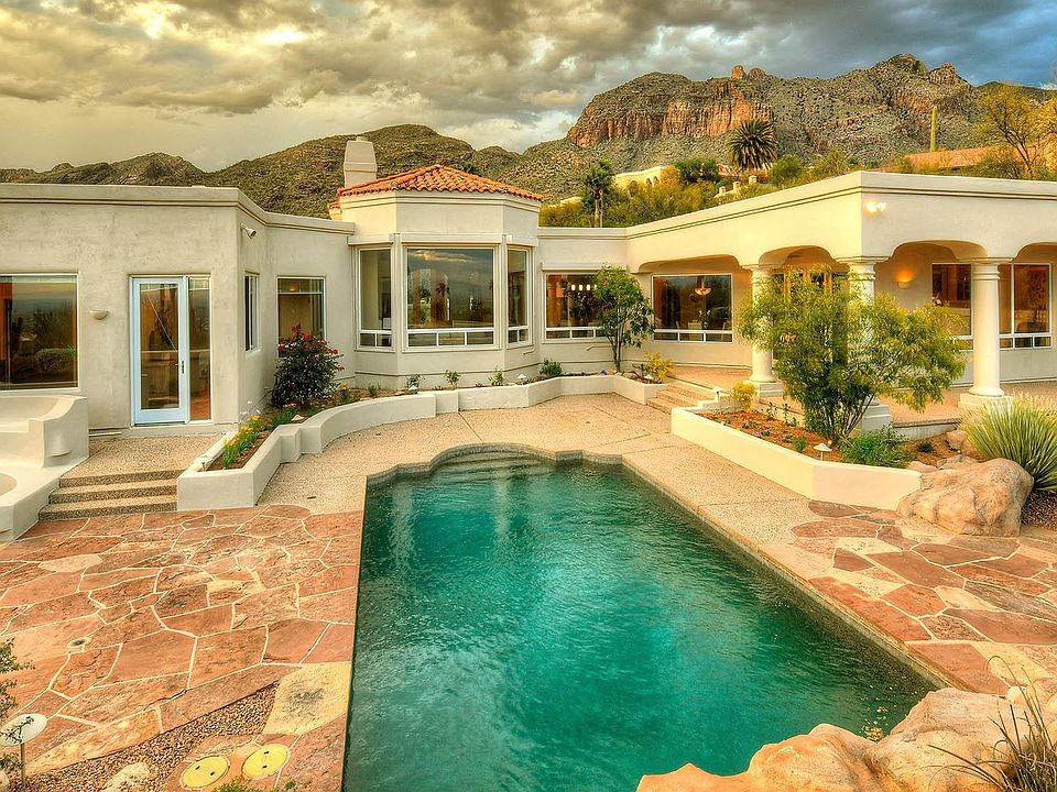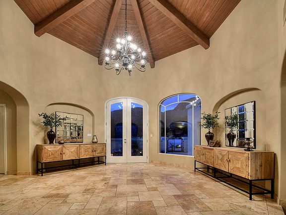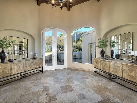Exclusive guard gated Cobblestone home w/ CATALINA MOUNTAIN & CITY VIEWS! Contemporary home sits at end of cul-de-sac w/ 4365 square feet. Front courtyard leading you in to dome wood ceiling foyer & WOW view. Travertine Floors. Dining & living rooms. Chefs kitchen w/ high end stainless appliances, gorgeous matte granite counters, wine fridge, soft close cabinets & drawers, pull-outs, breakfast bar, separate eating area, gas stove & opens to cozy great room w/ fireplace & french doors to outdoor living. 5 bed/5 bath all ensuite, 5th bed w/own entrance. Luxurious master suite w/ sitting area, entrance to backyard, jetted tub & glass enclosed shower + large walk-in closet. Expansive back yard, w/lots of space, over looks city & mountain ranges w/built in BBQ, fire pit & Pebble Tec pool & spa.