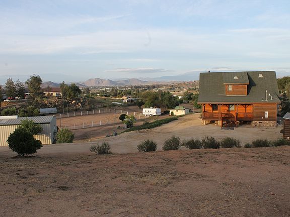 Stunning custom built log home overlooking Menifee. This secluded, yet close to town property has been situated to take advantage of the panoramic views of city lights, the San Jacinto Mountains, and the Big Bear Mountains. The fully usable lot has water spigots and electrical all the way to the back fence line. Inside the home you will find extensive use of knotty pine with wood beam and cathedral ceilings. The the downstairs features a great room that is perfect for entertaining and the master bedroom. The kitchen is equipped with a copper vent hood on the stove, large center island, deep country style copper sink, and walk-in pantry. The great room is also equipped with a wood burning stove! Upstairs you will find a second bedroom and bathroom as well as a loft with office area. Outside the property has been well equipped for a horse lover or contractor. There is a 50x30 steel constructed workshop with electric, water, skylights, and swamp cooler. The property is on city water, but does have a well with a 1500 gallon tank and solar powered pump for landscaping. There is a large riding arena, riding ring, two corrals, a tack room, small hay barn, log cabin style shed, and another steel storage lean-to. The property is fully fenced and has an electric gate with remote and keypad openers. More photos will be uploaded within 48 hours.