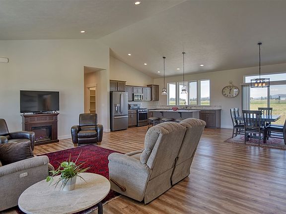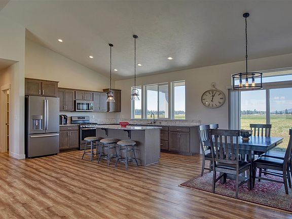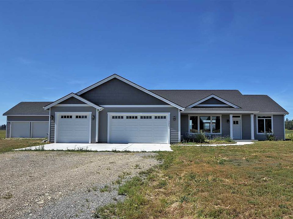 All one level home, newer build, on acreage. Big open great room with high ceilings, island kitchen with granite countertops and gas range. Master suite, walk-in closet, dbl sink & shower on one end of the house. The other end has 2 bedrooms and a bathroom. Informal dining room and island for eating space allows for large gatherings and lots of space. Laundry room has utility sink and massive storage space before entering 3 car garage. Garage has man door out the back to the big shop. Head to the massive 30x36 shop with 4 doors. Shop has power and 3 doors are powered, 4th tall door is manual. The siding of shop matches the house exterior siding. The well is high producing with 80 gpm.