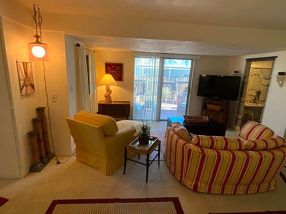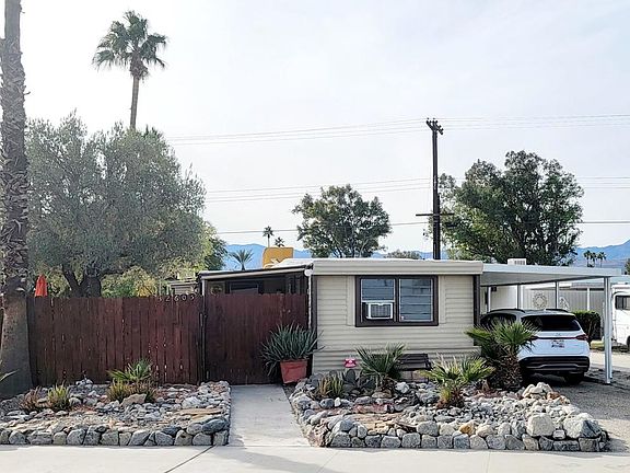 MOTIVATED SELLER: This Desert Oasis landscaped gem is one to take a look at, displaying Serenity, privacy, relaxing mountainous view from the outside patio. It offers a comfortable space to make your own, with 2 bedrooms and walk in closet space, 1 bath along with new gas range, swamp cooler, water heater and garbage disposal. New Carport installed. This property comes furnished as is condition. It is walking distance to the clubhouse, comes with complimentary golfing to the registered owners and best of all you own the land. This unique property at the Tri Palm Estates offers an active 55+ living with 2 golf courses, pool, spa, shuffleboard, tennis, lounge, and more.
