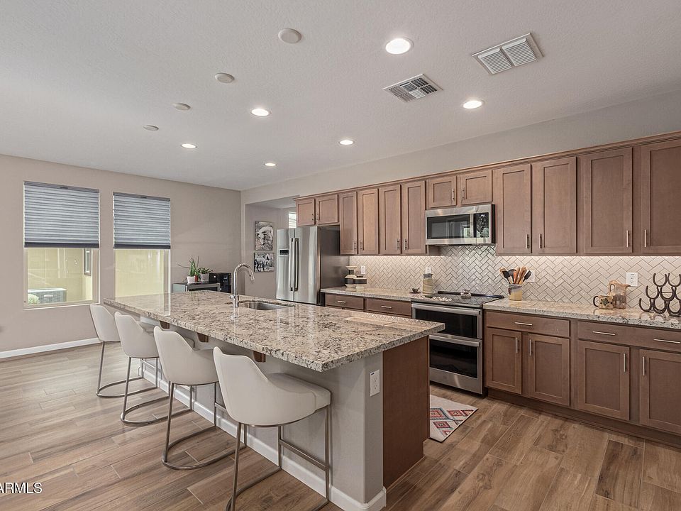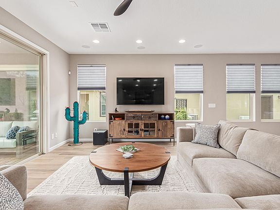 Former Model Home in Wickenburg Ranch! This 2-bed, 2-bath plus den residence features premium finishes including granite countertops, designer cabinetry, upgraded flooring, and custom window coverings. A versatile den adds space for an office, hobby room, or guest retreat. Clean lines and a neutral palette create an inviting feel, perfect for full-time or seasonal living. Enjoy lock-and-leave convenience with HOA-maintained landscaping, all just a 5-minute walk to the golf course, clubhouse, and amenity center with pool, pickleball, and more.