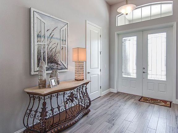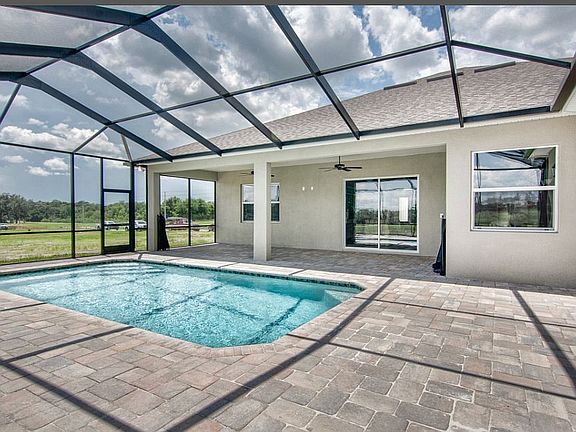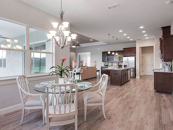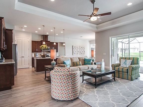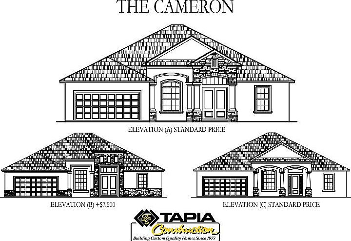 Model home by premier builder Tapia Homes, The Cameron. The upgrades in this home include screened salt-water pool, circular driveway, wood-look tile in living area, wine bar in kitchen, white cabinets and granite around sink in laundry room, orange peel finish on interior walls, epoxy coating on garage floor, and impeccable landscaping.